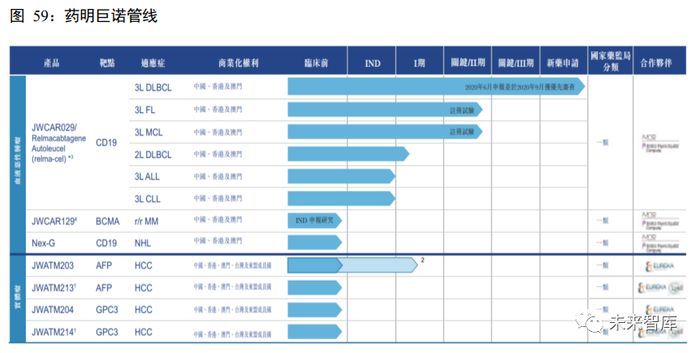 药明巨诺是由全球细胞免疫疗法的领军企业 Juno Therapeutics 与药明康德共同在中国建立的 CAR-T 细 胞免疫疗法技术研发商,公司成立于 2016 年 2 月。10 月 18 日通过了港交所聆讯,有望成为继南京传奇后 第二家登陆资本市场的 CAR-T 企业。公司的主打候选产品 Relmacabtagene autoleuce l(relma-cel)是针对复 发或难治 B 细胞淋巴瘤的抗 CD19 CAR-T 疗法,且国家药品监督管理局已于 2020 年 6 月受理审查公司将 relma-cel 用于 DLBCL 三线疗法的新药申请。