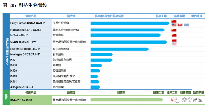 公司已率先启动了多项治疗复发/难治性实体瘤的 CAR-T 临床研究项目,包括针对肝细胞癌(HCC)和 肺鳞癌的 CAR-GPC3-T 项目,CAR-EGFR / EGFRvIII-T 试验用于胶质母细胞瘤,CAR-Claudin18.2-T 用于胃 癌和胰腺癌等的临床研究。目前科济生物已经获得多项国内外的CAR-T 细胞新药临床试验许可,其中 BCMA CAR-T 细胞药物还分别获得美国和欧盟药监局的"再生医学先进疗法(RMAT)"和"优先药物(PRIME)" 资格。
