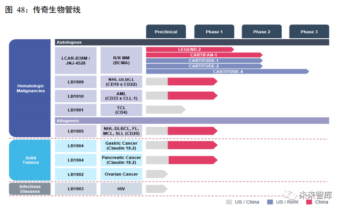 除 LCAR-B38M 为代表的 CAR-T 疗法外,南京传奇还布局 TCR-T 及同种异体细胞疗法,适应症还包 括实体瘤及传染病等领域。