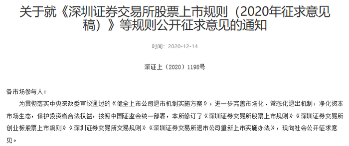 12月14日,沪深交易所向市场发布了退市新规的征求意见稿。借鉴了科创板、创业板的注册制改革经验,对退市指标、退市流程、风险警示情形及退市相关交易安排等进一步完善优化。