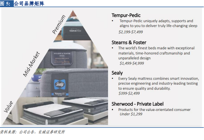 品牌及产品:不断完善品牌及产品矩阵,构建多元、清晰的产品体系。基本完成品牌矩阵布局,覆盖各类市场需求。公司目前已拥有Tempur-Pedic、Stearn&Foster及Sealy三大自主品牌。其中Tempur-Pedic聚焦高端市场,产品以记忆棉材质为主,价格带介于1999美元-7499美元之间;Stearns&Foster品牌定位中高端,产品以记忆棉和弹簧等复合材质为主,价格带位于1499-4999美元之间;Sealy定位中端市场,以弹簧及复合材质为主,价格带介于399-2499美元。2020年1月,公司收购美国著名床垫代工商Sherwood Bedding以更好地覆盖渠道品牌市场。