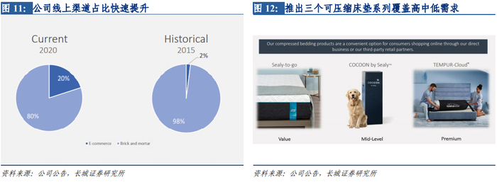 积极拥抱电商化趋势,推出多款可压缩床垫。公司线上渠道包括Tempur官网及第三方线上平台,截至20Q3公司线上渠道收入占比达到20%,较2015年提升18pp。为更好适应电商销售,公司在产品端也做出相应的调整,例如推出三个压缩床垫锡类以覆盖高中低三档市场。