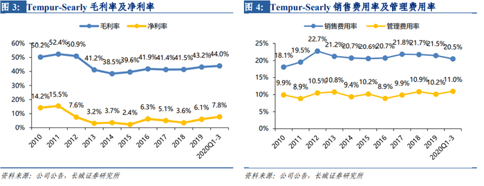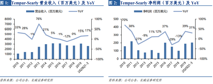 公司进入成熟期,单一客户依赖导致业绩波动。经过三十年深耕,公司发展已进入成熟期。2015年起,随着美国两大床垫巨头Mattress Firm及Sleepy’s的合并,公司对第一大客户的销售占比高达25%。单一渠道依赖度较高为公司后续发展带来一定的隐忧,2016年Mattress Firm受电商冲击销售下滑,拖累Tempur收入端。2017年Mattress Firm陷入破产危机并与Tempur解除合约,当年Tempur对Mattress Firm的销售额从2016年的6.69亿美元下降至0.96亿美元,直接导致Tempur2017年收入端下滑12%,利润端下滑29%。2018-2019年,公司通过细化产品矩阵及深化渠道布局,逐渐从Mattress Firm带来的阴霾中走出,焕发新生机。2019年公司营业收入31.06亿美元,同比+14.9%,净利润1.89亿美元,同比+38.5%;2020Q1-3,公司收入端同比+17%,利润端同比+31%。