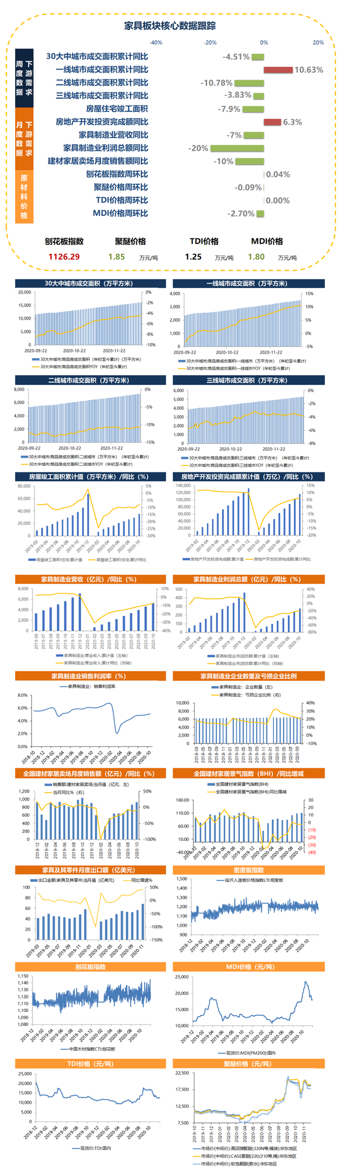 家具出口延续上行,重点推荐【梦百合】、【敏华控股】。11月家具及零件出口金额69.67亿美元,同比+41.92%,环比10月+ 9.7pp。家具出口金额6月起转正,此后增速逐月提升。海外疫情尚未得到缓解,供给端仍面临产能不足的问题,国内家具出口景气度有望延续。原材料端,MDI及聚醚延续回落趋势,成本端压力影响较为短期。重点推荐回调下凸显布局价值的【梦百合】:短期看,美国床垫行业供给端在疫情及二轮反倾销的双重压力下持续出现供给不足问题,公司凭借领先的欧美产能布局可在此窗口期实现订单的快速集中。中长期看,公司自主品牌业务逐渐步入正轨,海内外自主品牌业务建设同步推进。同时推荐【敏华控股】:后疫情时期充分把握“宅经济”机会,内销持续改善,外销下半年开始快速恢复。中长期看,公司在功能沙发细分行业已形成产品、品牌、渠道全方位护城河,引入职业经理人后管理精细化程度有望进一步提升,国际化互联网企业管理思维将提升公司管理现代化、国际化程度。