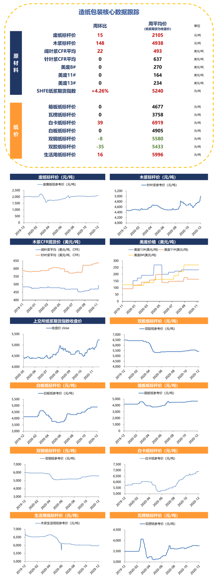 本周市场以稳定为主。箱板瓦楞纸:上周瓦楞纸南方市场调价较为活跃,北方多数维稳观望。箱板纸整体市场报价稳定,交投气氛有所好转。白卡纸:上周白卡纸偏强震荡,局部上移;进口木浆外盘报涨,纸浆期货主力合约持续强势拉涨,成本面信心推动白卡纸价格震荡上涨。文化纸:本周铜版纸价格窄幅下调,双胶纸行情偏弱,市场价格略有松动,主要原因是目前以社会订单为主,需求面支撑较弱。