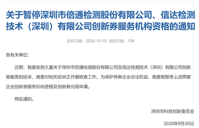 不过也正是这些小微企业主的投诉,在10月初,深圳科创委发布通知,暂停了倍通检测和信达检测两家企业创新券服务机构资格及创新券兑现申请。
