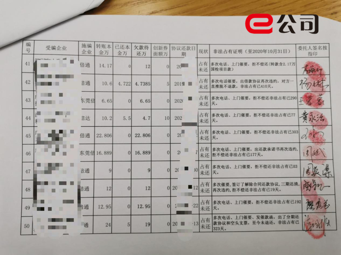 另外,企业主代表海泉(应要求化名)介绍,他们通过倍通内部员工获悉,相关被套路企业有700多家,涉及金额7000多万,“不过真伪有待核实,那个员工怕倍通威胁,不敢爆出来。”但e公司记者获悉,这些企业主已经统计的资料并不完备的受害企业名单则达数百家。“很多企业不愿提交详尽资料。”