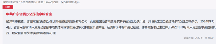 人民网领导留言板下,也有前员工对倍通恶意欠薪的投诉,其下广东省委办公厅回复称“经深圳市核查,此前倍通检测已因经营问题与多家单位发生经济纠纷,并与员工因工资结算多次发生劳动争议······建议留言网友继续循诉讼程序办理。”