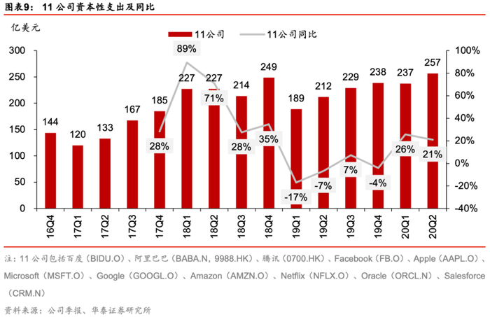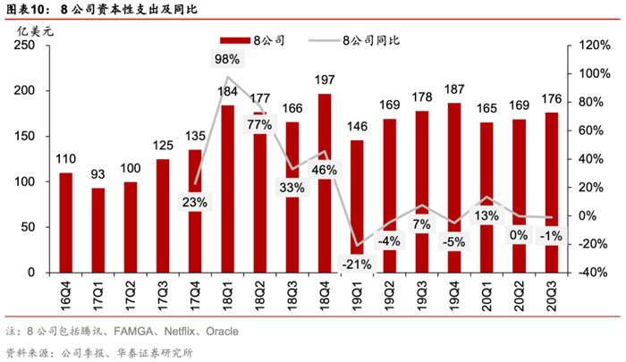 下游需求旺盛,巨头CAPEX增长趋势有望保持。从巨头CAPEX情况看,2020前两季度,11公司加总的资本性支出均保持了20%以上的同比增长率。20Q2,11公司资本性支出共计257亿美元,环比增长8.4%。将已经公布三季报的8家公司资本性支出进行加总,20Q3,8公司资本性支出合计176亿美元,环比增长4%。虽然受疫情冲击同比略有下降,但环比不断增长的趋势也反映出下游需求逐步恢复。我们认为,在2021年下游需求增长趋势的推动下,巨头CAPEX有望保持增长。