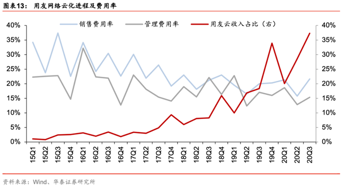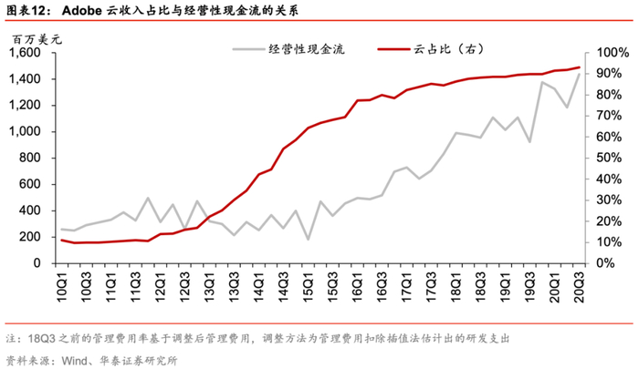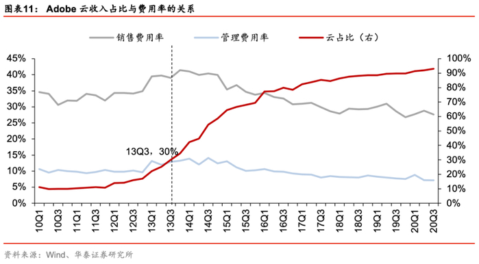 伴随云转型深入,财务指标改善将逐步显现。云模式相比传统的软件模式,从成本端看具有云端运维节省人工成本、滚动销售节省销售成本的优势;从收入端看,云模式便于功能革新,人工智能、大数据等应用也有助于提升客单价。综合来看,随着云转型的深入,费用率、现金流等财务指标会呈现逐渐改善的趋势。从海外软件公司转云历程看(以Adobe为例),当云收入占比超过30%时,费用率开始逐步下降,现金流也呈现改善迹象,本质是云模式本身云端运维、滚动销售等优势所致。