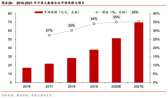 近年来,随着中国近几年各企事业大数据信息化建设需求的增加,叠加政策对各类数据安全的保护要求提升和各类数据泄密事件影响,中国大数据安全作为新兴安全市场、其规模也持续高速增长。根据赛迪咨询数据,2020年的总规模预计达到51.5亿元。随着大数据安全市场的成熟,年均增长率在逐步提高。当前,大数据安全业务已经被各大传统安全企业纳入未来企业战略,日益成为布局重点和重要商业化盈利点。
