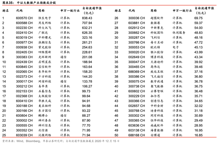 中证大数据产业指数于2020年12月14日进行成分股定期调整。本次调整后,纳入两只科创板股票(688369 CH致远互联和688168 CH安博通)。本次调整后的成分股及对应行业如下表所示(自由流通市值数据截至2020年12月15日)。