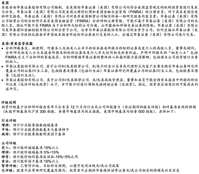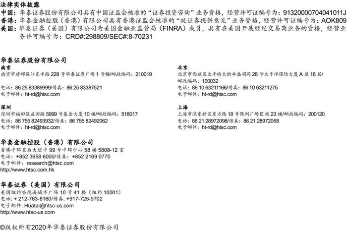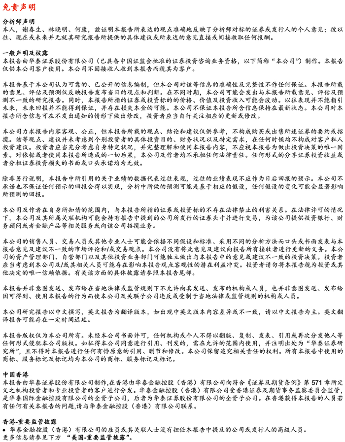 在任何情况下,本公众号中的信息或所表述的意见均不构成对客户私人投资建议。订阅人不应单独依靠本订阅号中的信息而取代自身独立的判断,应自主做出投资决策并自行承担投资风险。普通投资者若使用本资料,有可能会因缺乏解读服务而对内容产生理解上的歧义,进而造成投资损失。对依据或者使用本公众号内容所造成的一切后果,华泰证券及作者均不承担任何法律责任。