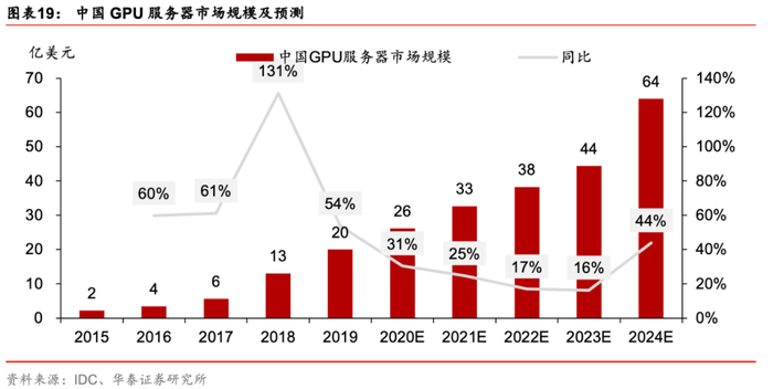 AI服务器需求点:数据类型的增加。AI服务器主要是通过GPU等加速卡,增强服务器并行计算的能力,从而适应云计算、大数据、人工智能等新场景需求。随着计算机视觉数据,语音数据,自然语言处理数据等多种类型的数据逐步累积,AI服务器需求有所显现。从5G推广看,物联网技术,大数据技术的应用有望进一步渗透。传统行业内,智慧城市,反欺诈,视频监控分析等应用有望逐步落地。从AI基础设施应用看,目前以互联网行业用户为主,而交通、通信、公共事业等行业也处于快速增长中,未来传统行业的AI应用有望进一步增长。据IDC预测,2024年我国GPU服务器市场规模将达到64亿美元,2019-2024年CAGR预计达到26.1%,AI服务器增长需求有望延续。