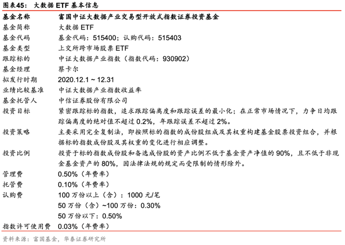 富国中证大数据产业交易型开放式指数证券投资基金(基金代码:515400;认购代码:515403),简称大数据ETF,该基金属于上交所跨市场股票ETF,标的指数为中证大数据产业指数(指数代码:930902),投资目标为紧密跟踪标的指数,追求跟踪偏离度和跟踪误差的最小化。基金主要投资于标的指数成份股、备选成份股,投资于标的指数成份股和备选成份股的资产比例不低于基金资产净值的90%,且不低于非现金基金资产的80%。大数据ETF募集期自2020年12月1日至12月31日。