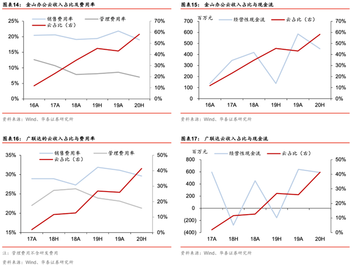 2021年随我国软件企业云转型深入,财务指标改善或将持续。从我国软件企业云转型的推进情况看,伴随着2020年云转型逐步深入,部分企业已经出现财务指标改善的迹象。其中,用友网络、广联达(002410.CH)、金山办公(688111.CH)近年来云转型迅速推进,至20H,广联达、金山办公云收入占比分别为41%、58%,用友网络20Q3云收入占比达到37%。从转型成效看,费用率指标也均随着转型的深入呈现出不同程度的下降趋势。金山办公、广联达的现金流指标也呈现改善的趋势。我们认为,2021年随着云转型的进一步深入,财务指标改善的趋势有望持续。
