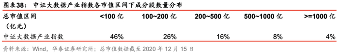 下面从成分股的数量分析指数市值特征,将个股总市值划分为小于100亿、100~200亿、200~500亿、500~1000亿以及大于1000亿这五个区间,各市值区间下成分股数量分布如下表所示。中证大数据产业指数以中小市值股票为主,市值小于100亿股票数量占比46%,市值在100~200亿股票数量占比为26%,大于1000亿股票数量占比为4%,该指数具有鲜明的中小市值风格特征。