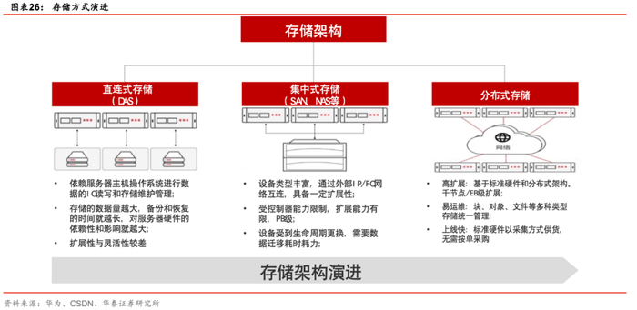 存储系统从最早的直连存储(DAS),到后来的集中存储(SAN、NAS、全闪等),而目前随着企业用户存储数据量的增加,分布式存储的优势开始逐渐体现。分布式存储将位于不同空间的数据就近存储,完成了数据存储的去中心化,各个节点的资源可以得到很好的协调,由于利用了更多的机器处理更多的数据,单机压力减小,带宽要求降低,同时也解决了传统的本地文件系统在文件大小、文件数量等方面的限制。
