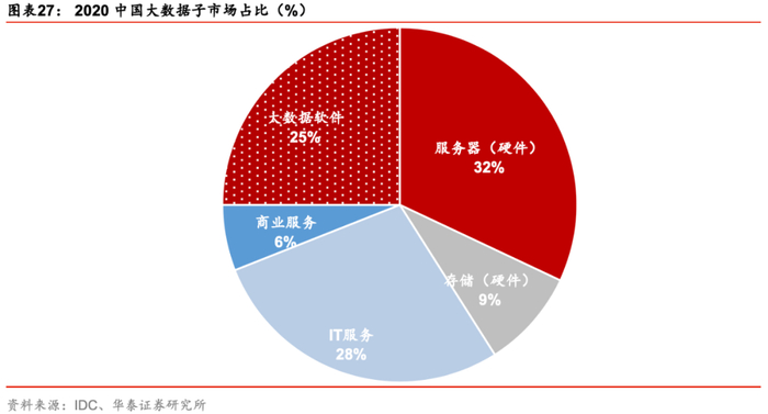 从子市场来看,2020年中国大数据市场最大的构成部分仍然来自于服务器和存储,传统硬件部分占比超过40%,其次为IT服务和商业服务,两者共占33.6%的比例,剩余由25.4%的大数据软件所构成。从软件角度来看,2020年中国最大的三个细分子市场依次为终端用户查询汇报分析工具、人工智能软件平台以及关系型数据仓库,并且IDC预计,三者总和占中国整体大数据软件市场的比例接近50%。