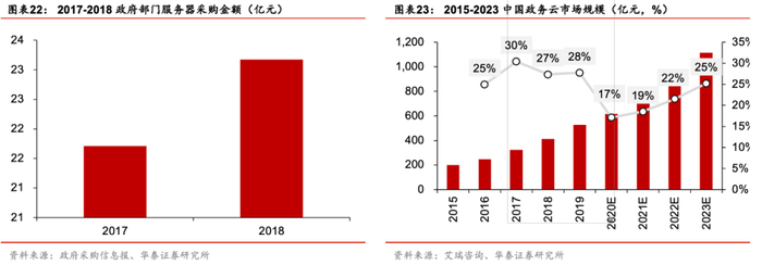 政务云用云量增长迅猛,超过了工业、金融、互联网等其他行业,预计未来几年仍保持稳定增长,根据艾瑞咨询数据,到2023年我国政务云整体市场规模可达到1,114.4亿元,未来四年的年复合增长率为20.6%。随着疫情逐渐得到控制,复工复查不断推进,中国经济逐步回归到正常水平,政务云市场有望回暖,同时考虑到我国政务云建设尚处于起步阶段,我们可以推测,依靠政务云而带动的国内服务器市场替代空间广阔。