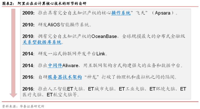 云计算通过底层IT重构,打破海外IT企业对核心IT基础资源和环节的垄断。中国IT企业有望迎来发展机会。我们可以通过阿里云在云计算领域核心技术环节的自研情况,来了解中国云计算厂商已经取得的核心技术优势。