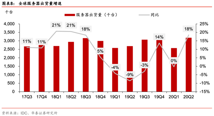 上一轮服务需求周期启动的时间是在2017年,据IDC数据,2017Q2,全球服务器收入增速由负转正,出货量也保持增长,这一轮服务器需求驱动的因素主要来自于CSP(云厂商)对云服务器需求的拉动。2019年服务器市场进入低迷期,出货量及收入均呈现低速增长或同比负增长的趋势,20Q1受疫情冲击服务器市场增速较低,20Q2疫情推动云服务需求上升,全球服务器营收及出货量增速有所恢复。