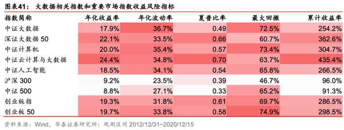统计区间内(2012年12月31日至2020年12月15日)中证大数据产业指数表现和其它大数据相关指数表现接近,整体优于沪深300、中证500、创业板指等主要宽基指数。计算指数收益风险指标,中证大数据产业指数与其它大数据相关指数、创业板指、创业板50指数较为接近,年化收益率、年化波动率、夏普比率均高于沪深300和中证500指数,具有典型高Beta属性,适合预期风险水平较高,同时有大数据产业配置需求的投资者。