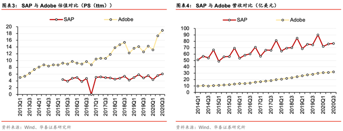 2)SAP的云收入占比比较小,所以估值低(2018年SAP云收入占比20%,Adobe云收入占比89%);