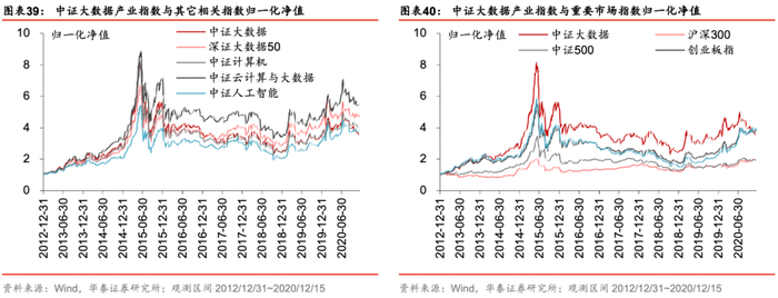 横向考察2020年12月15日大数据相关指数和重要市场指数的估值指标以及各指数发布以来历史分位数,如下表所示。从市盈率角度看,中证大数据产业指数市盈率相对较高,仅低于中证云计算与大数据主题指数。从市净率角度看,中证大数据产业指数市净率低于中证计算机指数、中证云计算与大数据指数、中证人工智能指数、创业板指和创业板50指数,高于深证大数据50指数、沪深300指数和中证500指数。