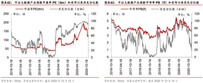 纵向考察中证大数据产业指数历史估值水平。截至2020年12月15日,该指数市盈率PE(ttm)为112.8倍,处于指数发布日(2016年10月18日)以来的88.9%分位数。该指数市净率PB(lf)为4.9倍,处于90.7%历史分位数。