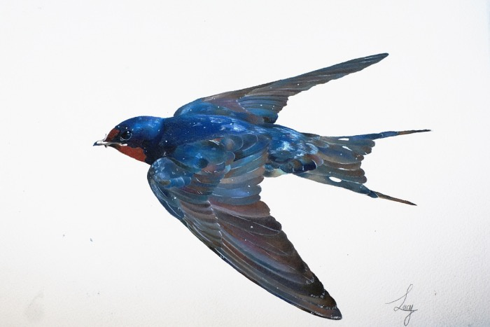《诗经·邶风·燕燕》有“燕燕于飞,差池其羽。之子于归,远送于野。瞻望弗及,泣涕如雨”,描述了深婉动人的送别情境。燕子的背羽在阳光下其实是蓝黑色的,泛着金属的光泽。张可航 手绘