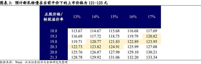 静态看,预计目前平价下新乳转债上市首日获得的转股溢价率在13%-17%区间内,价格为121-125元。