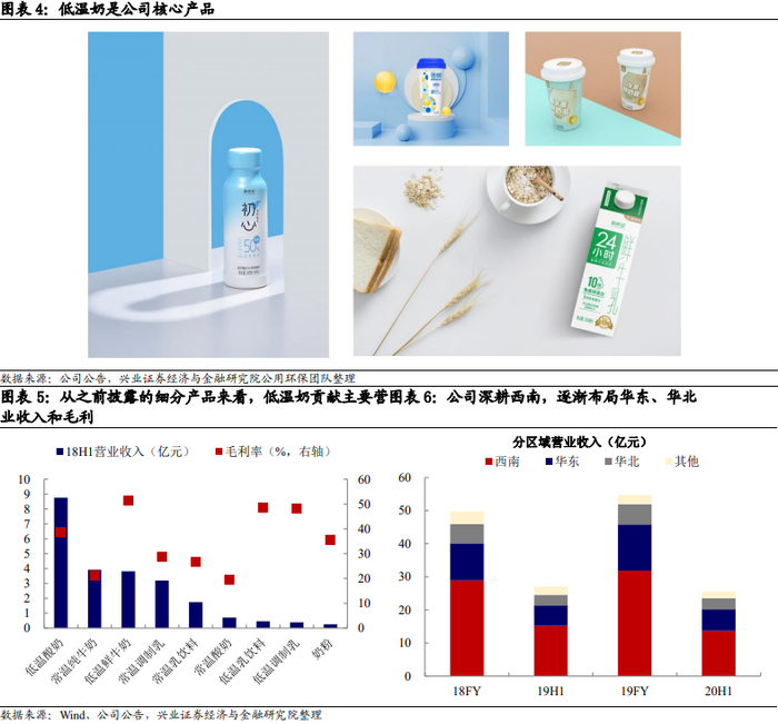 目前公司财报中仅披露液体乳(20H1营收占比约为93%)和奶粉业务信息,但从2018H1的情况看,彼时其低温酸奶、低温鲜牛奶合计营收占比为54%,并贡献65%毛利。公司也在2020年中报披露其报告期内低温产品销售收入占比仍然保持在60%以上。这即是说,应当将低温奶看做公司核心赛道,这与普通乳制品为主的企业(例如伊利股份)存在区别。