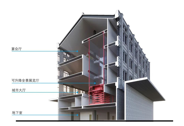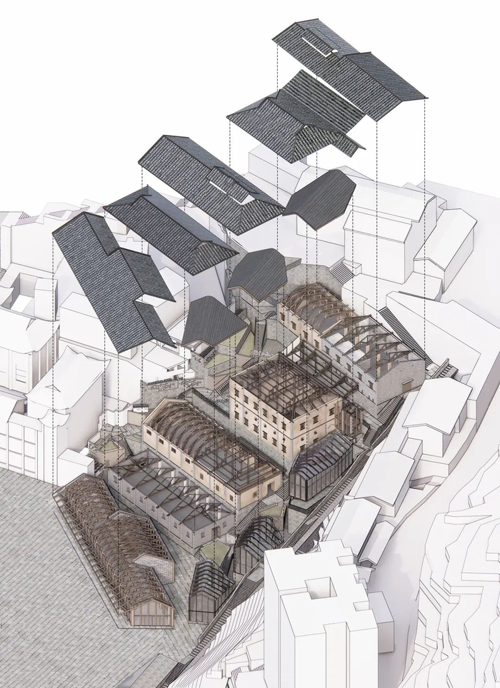 结合2015年发布的《重庆市历史文化名城保护规划》、《重庆市主城区传统风貌保护与利用规划》,历史遗产微更新采取灵活多样的更新活化方式,重构与当代城市生活、文化与经济的密切联系(图17)。十八梯街区内历史建筑火柴原料厂因损毁严重,以“落架大修”尽力复原外观后,在内部置入展览、体验等全新功能(图18)。由张永和率非常建筑团队承担改造设计的“重庆故宫学院”,基于故宫文物南迁库存于此的历史事件,针对不同等级历史建筑,分别采用落架重修、原基底重建、原址新建等多种方式实现场所的更新,同时引入新的胶合木桁架结构,以尊重、含蓄又保持创造的态度实现新旧对话与有机更新。(图19)