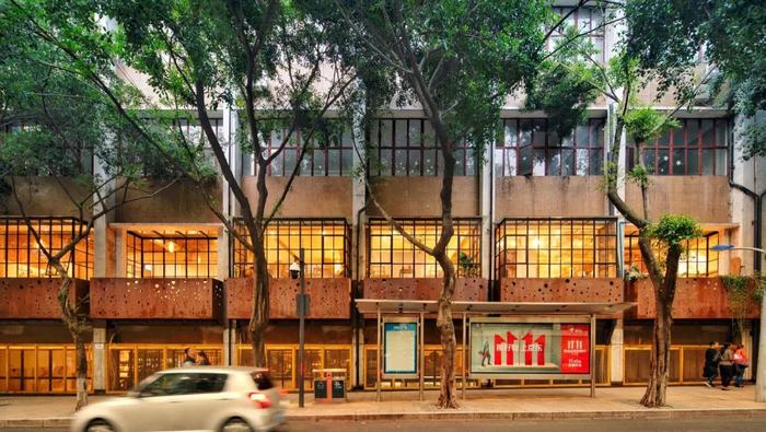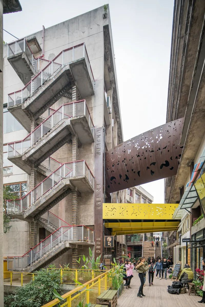 工业遗存微更新方面,重庆也正在积极探索。2014年率先启动更新的原重庆印制二厂,以增补的方式在园区各厂房之间设置艺术化人行天桥,形成公共走廊体系,而立面仅去除存在安全隐患的部分后用新材料替换(图21、图22)。2018年启动更新的重庆印制一厂,抓住一厂临江山地、工业遗产的地理与历史双重优势,用建筑手段创造多种业态共同激活建筑单体与周边社区的发展(图23)。由重庆江北纺织仓库改造而成的北仓文创街区是民间自下而上针对工业类遗存的另一处实例。2015年,仓库启动更新改造,以城市文化图书馆、互联网+体验店为主题,以渐进式微更新方式逐渐成型,同时积极融入当代消费新需求,与原社区生活有机融合的同时孕育出新的城市文化生态(图24)。