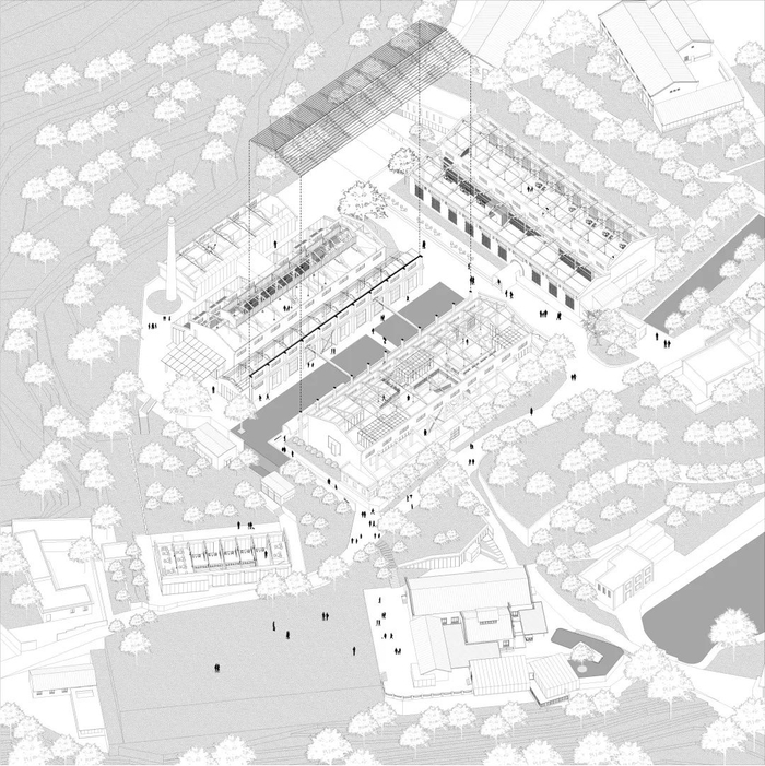 上:建筑分解轴测 左下:鸟瞰 右下:新建木桁架结构室内设计