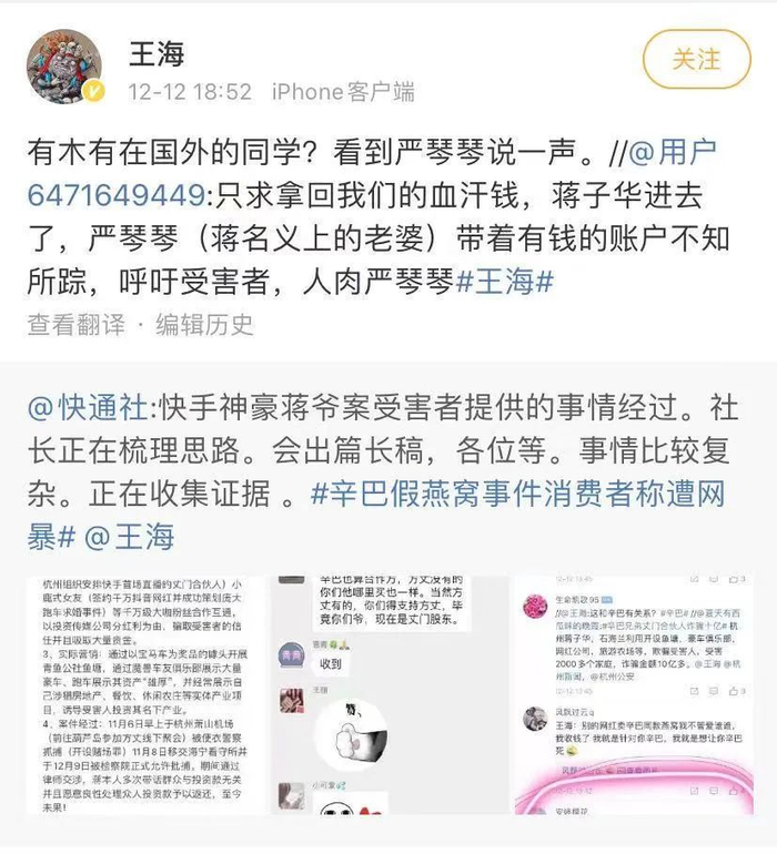王海的发声引起不少网友疑问,快手神豪蒋爷究竟是谁?为何他犯案会牵扯到辛巴?这起案件背后有何不为人知的秘密?