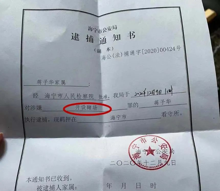 不过,蒋子华的骗局很快被戳破。12月9日,浙江海宁市公安局以涉嫌“开设赌场罪”逮捕蒋子华,由此曝出一起涉及2000多名人员,高达十亿金额的集资案件。