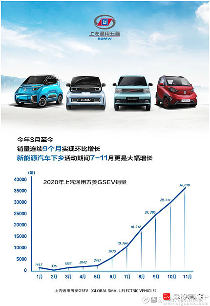 下面这张是上汽通用五菱电动车的销量图,包括五菱和宝骏,销量从1月的1417辆增长到11月的36070辆,月销量增长24倍!如果单独统计五菱,月度销量曲线会更陡峭。