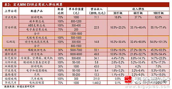 在所有配套供应商中,OBC的收入弹性是最大的,这里可以参考财通证券对五菱部件价值量及业绩弹性的测算: