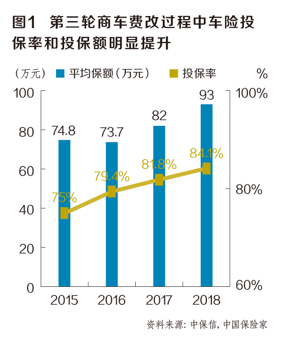 经过2015年以来的三次商车费改,车险行业责任划分越来越标准,在地区、险种类别以及使用性质的风险差别已被逐步抹平。从前期商车费改对财险行业的影响来看,行业效益确实有所提升,体现出了商车费改的部分良性结果。一是保险责任范围扩大,保障责任更为合理。二是定价方式更为合理,车均保费整体下降、折扣力度加大,投保率及保额也明显增长。三是出险率下降带来行业赔付率的改善(图1)。
