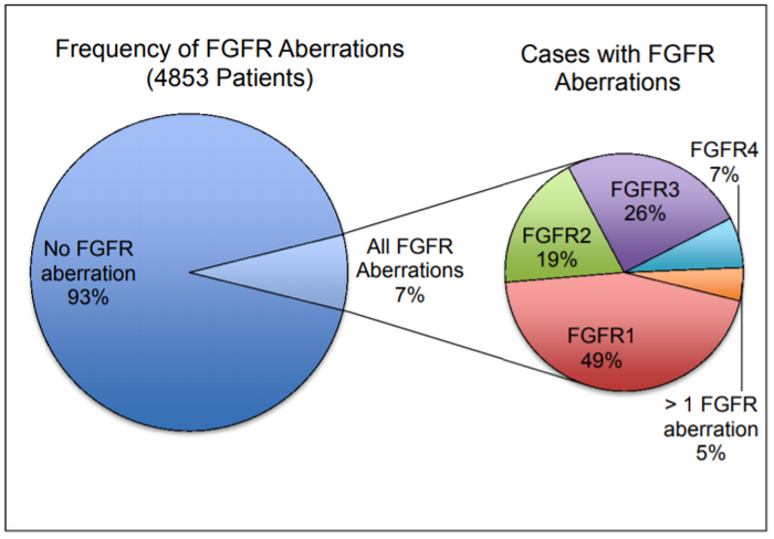 研究发现,FGFR基因异常在多种癌症中的普遍存在。根据2015年发表在Clinical Cancer Research的一项研究,针对4853个各类实体瘤的下一代测序(NGS)显示,大约有7.1%的癌症中发现FGFR畸变(aberrations),几乎所有检测的恶性肿瘤中均存在FGFR畸变,发生率较高的癌症有尿路上皮癌、乳腺癌、子宫内膜癌、鳞状上皮癌等。