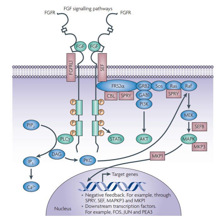 成纤维细胞生长因子受体(FGFR)属于酪氨酸激酶家族的一员,包括FGFR1、FGFR2、FGFR3、FGFR4四种受体亚型。由FGFR介导的信号传导通路包括RAS-RAF-MAPK,PI3K-AKT,信号转导子和转录激活子(STAT)以及磷脂酶Cγ(PLCγ)等。这些通路是正常细胞生长分化所必需的,参与新血管生成、细胞增殖和迁移、调节器官发育、伤口愈合等生理过程。因此,FGFR基因又被称为重要的发育基因。