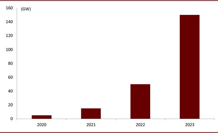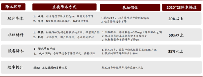 ►非硅材料假设:银浆方面,目前HJT组件主要采用9主栅结构,假设到2023年通过新的主栅技术银浆用量从200mg/片下降至100mg/片。假设低温银浆价格从8,500元/kg下降至与高温银浆基本平价的6,500元/kg。靶材方面,假设国产化后,耗量、价格均年降5%。