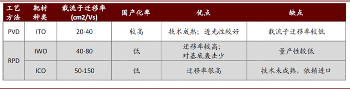 ►透明导电膜沉积:我们估计该阶段的设备价值量占比达到25%。目前沉积TCO存在RPD(反应等离子体沉积)和PVD(物理化学气相沉积)两种路线。RPD与PVD的区别在于:1)RPD工艺采用蒸发镀膜法制备IWO导电薄膜(氧化铟掺钨),对硅衬底的轰击较小,薄膜导电性好,有望制备更高效率的电池,但缺点在于设备价值量更高,且靶材尚未规模量产。此外,ICO(氧化铟掺镉)等性能更高的新型靶材也有望推出。2)PVD工艺则用直流磁控溅射制备TCO,较为成熟,量产性更好,但受制于材料ITO的性能更差,近年出现了用PVD法制备的新种类SCOT材料,有望拉近与RPD+IWO的差距。目前两种技术路线并存,捷佳伟创的RPD设备已经顺利在爱康科技的产线装机,而迈为股份自主研发的PVD也已获得产线订单。