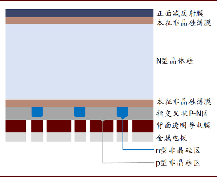 HJT+IBC:IBC(全称Interdigitated back contact,交叉背接触)工艺是将正负电极均移到电池片背面的技术,主要特点为P-N结在背面呈叉指状间隔排列,而正面无栅线遮挡,因此避免了遮光电流损失。HBC在IBC电池的基础上,背面依次插入本征非晶硅钝化层和透明导电膜层,具有更好的钝化效果。另一方面,相比于HJT,HBC结合了正面无遮挡的技术优势,同时正面采用SiNx减反射层代替TCO,进一步减少了光学损失。