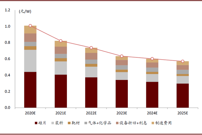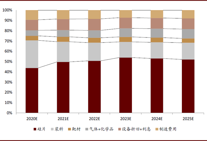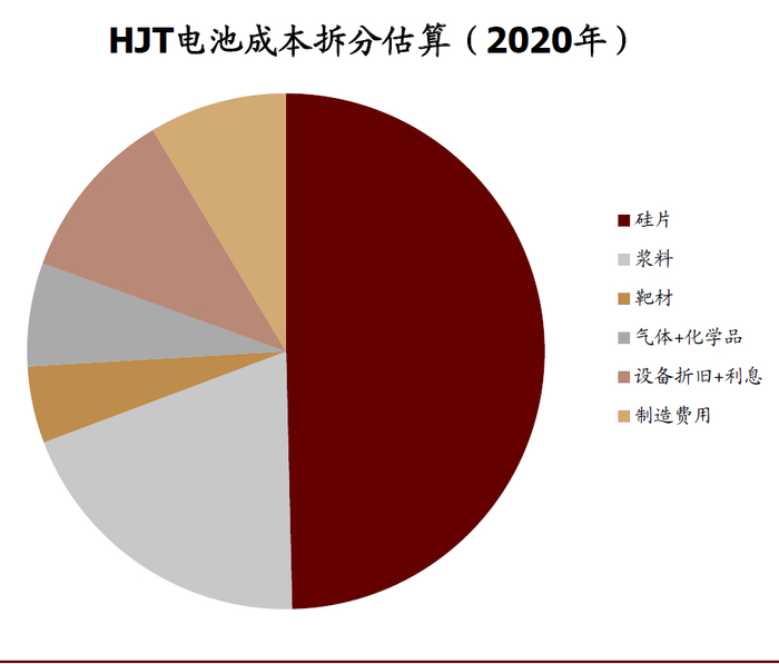 HJT电池的生产成本可拆分为硅片成本、非硅材料(包括银浆、靶材、气体及化学品)、设备折旧及产生的利息费用,以及其他制造费用(包括人工、动力成本)。