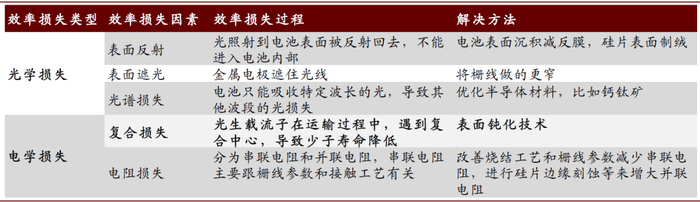 影响光伏电池片转化效率的因素主要包括光学损失和电学损失。光学损失包括光的表面反射、表面遮光和光谱损失等,电学损失包括少子复合损失、电阻损失等。电池片技术的种种改进,本质上都是为了解决以上的各种效率损失,其中,降低少子表面复合在提高转化效率中起着非常关键的作用。