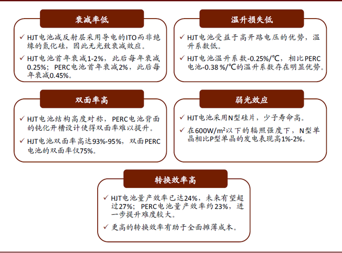 为什么说HJT有希望成为新一代主流技术?异质结(Heterojunction with Intrinsic Thin Layer, HJT)全称本征薄膜异质结,其通过在P-N结之间插入本征非晶硅层进行表面钝化来提高转化效率。基于HJT的诸多优点,其有可能会成为下一代主流技术:1)传统HJT理论转化效率或超27%;2)有衰减率低、温度系数低、双面率高、弱光效应等优点,全生命周期发电增益明显;3)制程只有4步,可缩短生产步骤;4)作为平台技术,与其他先进工艺叠加,有望进一步提高转化效率。