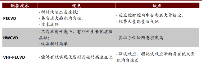 纳米晶硅/微晶硅是由非晶组分和晶粒共同组成的一种混和相材料。由于其相比非晶硅,内部结构更具有序性,因此具有掺杂效率高、电导率高等特点,同时又具有良好的长波响应特性,可与非晶硅组成叠层结构,提高太阳光谱响应范围。微晶硅材料的制备工艺与非晶硅基本相同,但在沉积参数上有所差异,常用的微晶硅沉积技术有PECVD、HWCVD(热丝化学气相沉积)以及VHF-PECVD(甚高频等离子体增强化学气相沉积)。